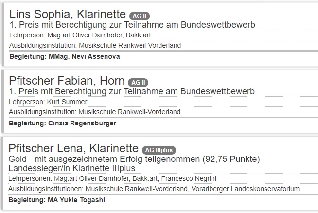 Ein großes Dankeschön auch an die Lehrpersonen Oliver Darnhofer und Kurt Summer von der Musikschule Rankweil-Vorderland und Francesco Negrini vom Vorarlberger Landeskonservatorium für die hervorragende Vorbereitung der Teilnehmer auf diesen Wettbewerb.