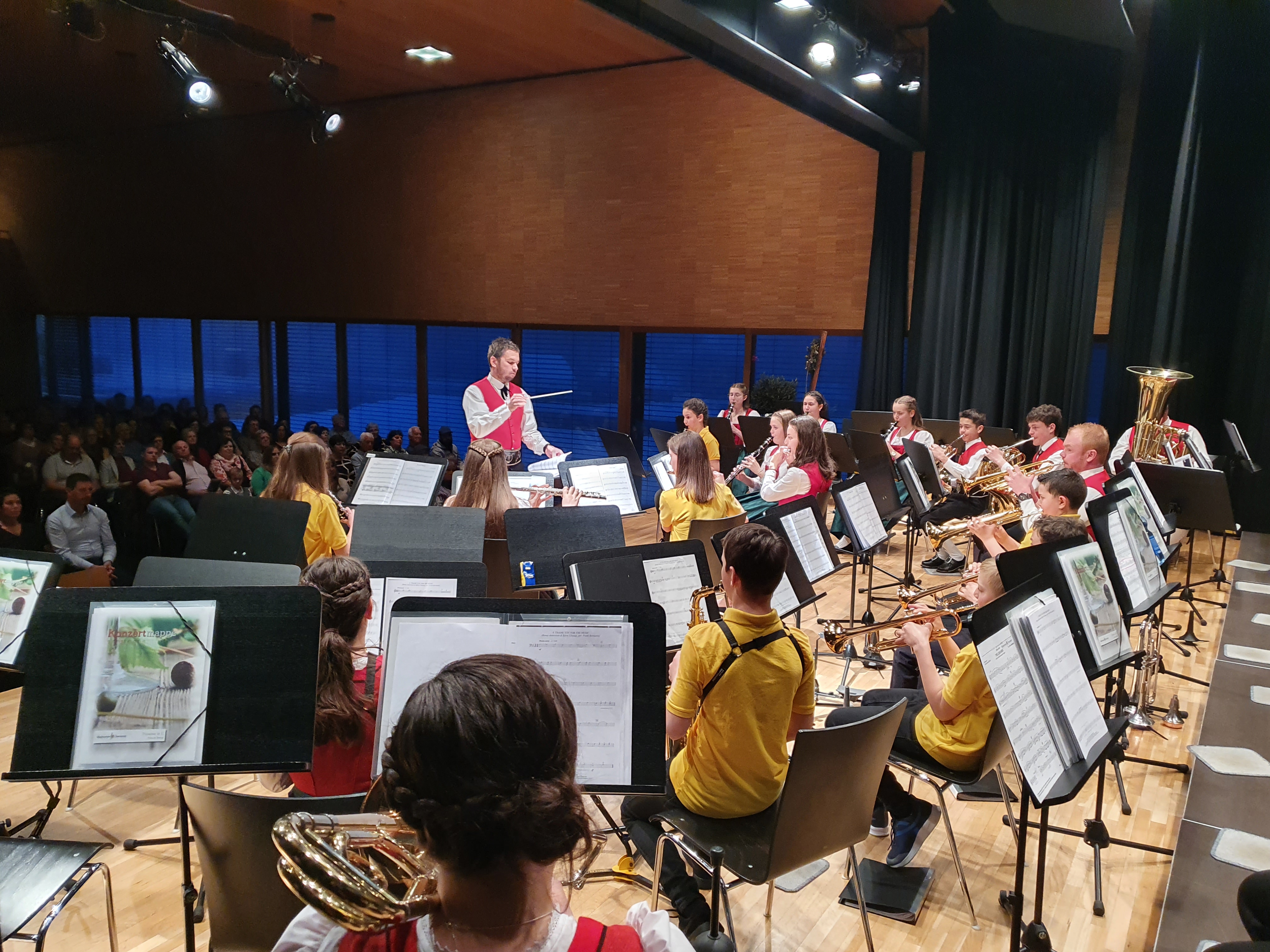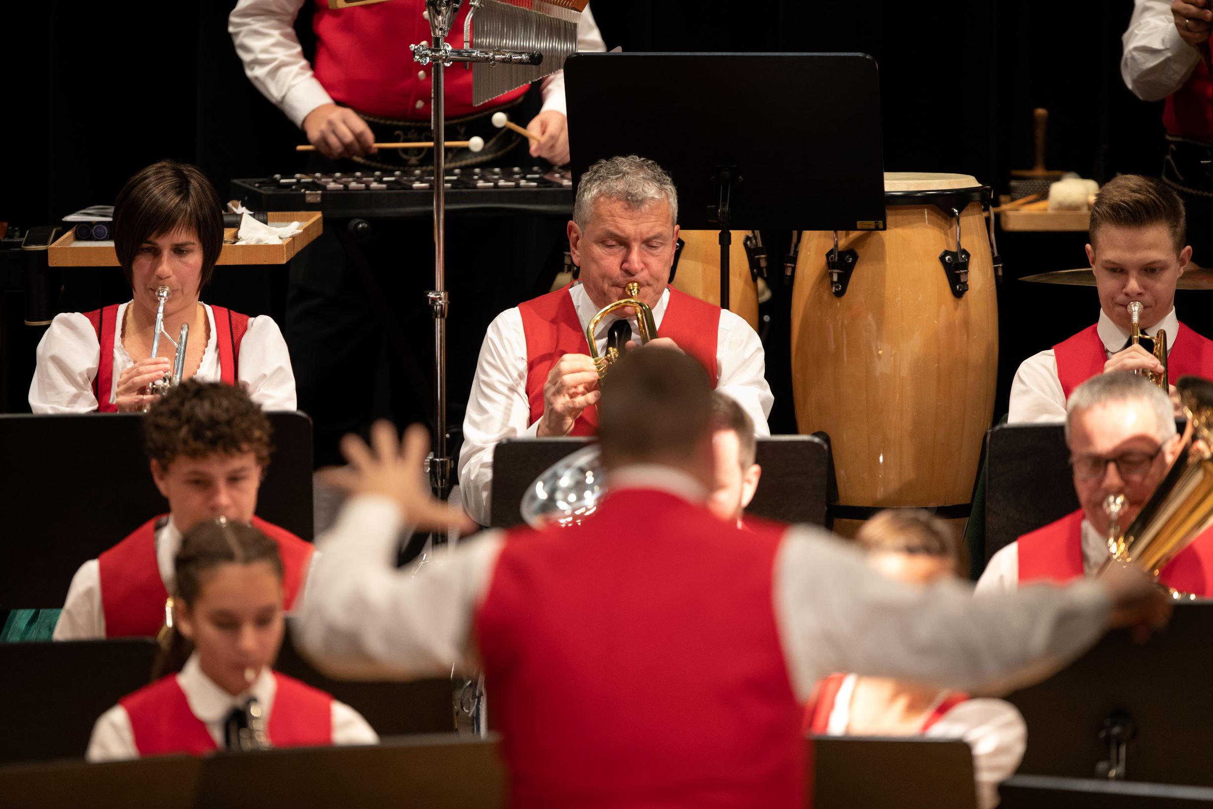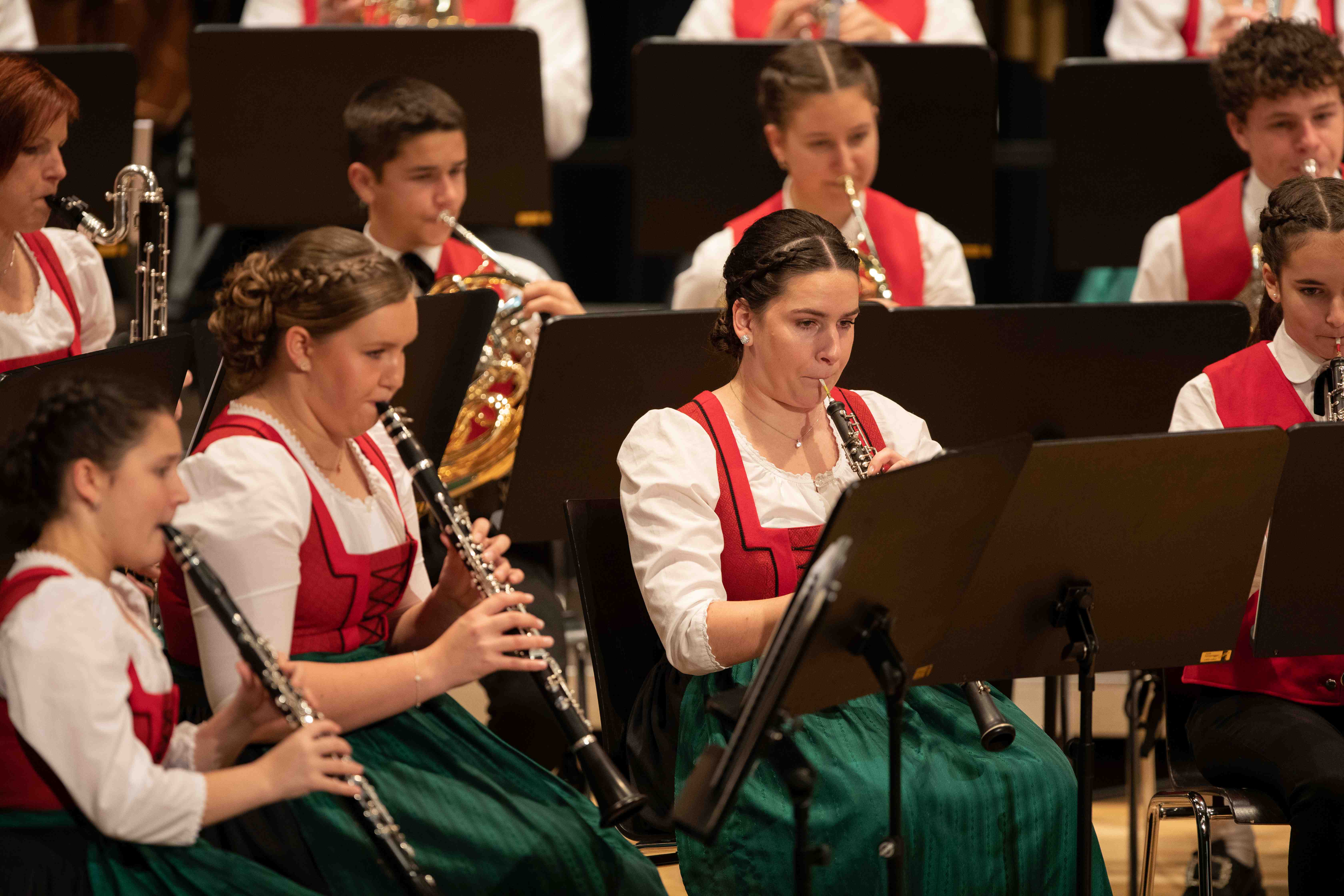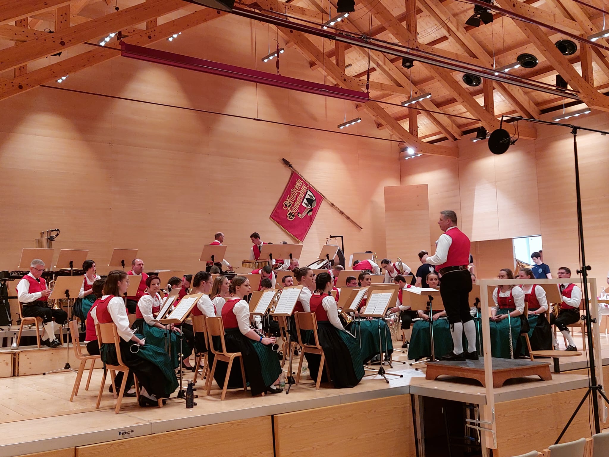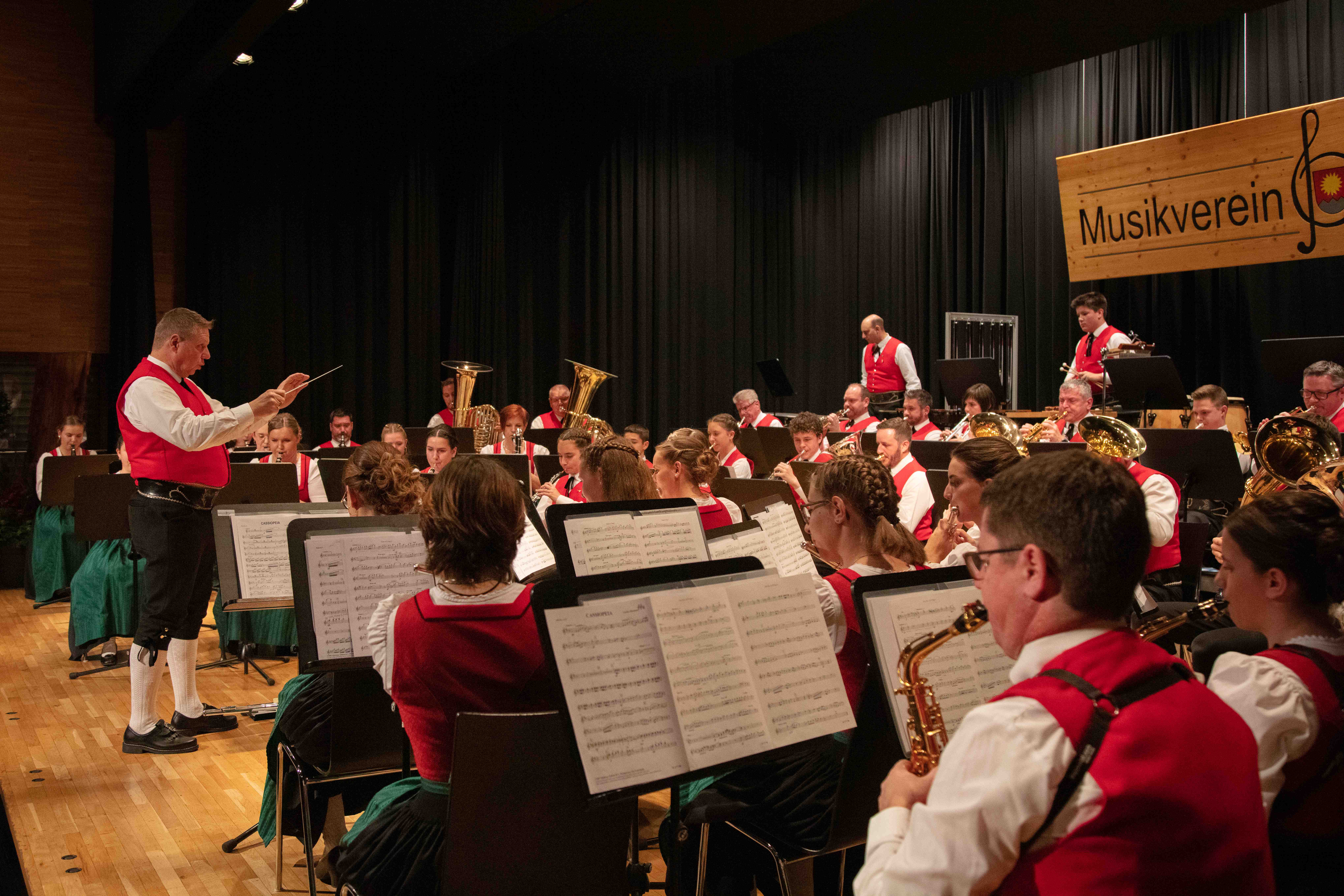 Nach der gekonnten Eröffnung durch den musikalischen Nachwuchs nahmen die Musikantinnen und Musikanten vom Musikverein auf der Bühne vom Dorfsaal Platz. Kapellmeister Heinz Lins hatte mit dem Musikverein wieder ein anspruchsvolles und abwechslungsreiches Konzertprogramm einstudiert.