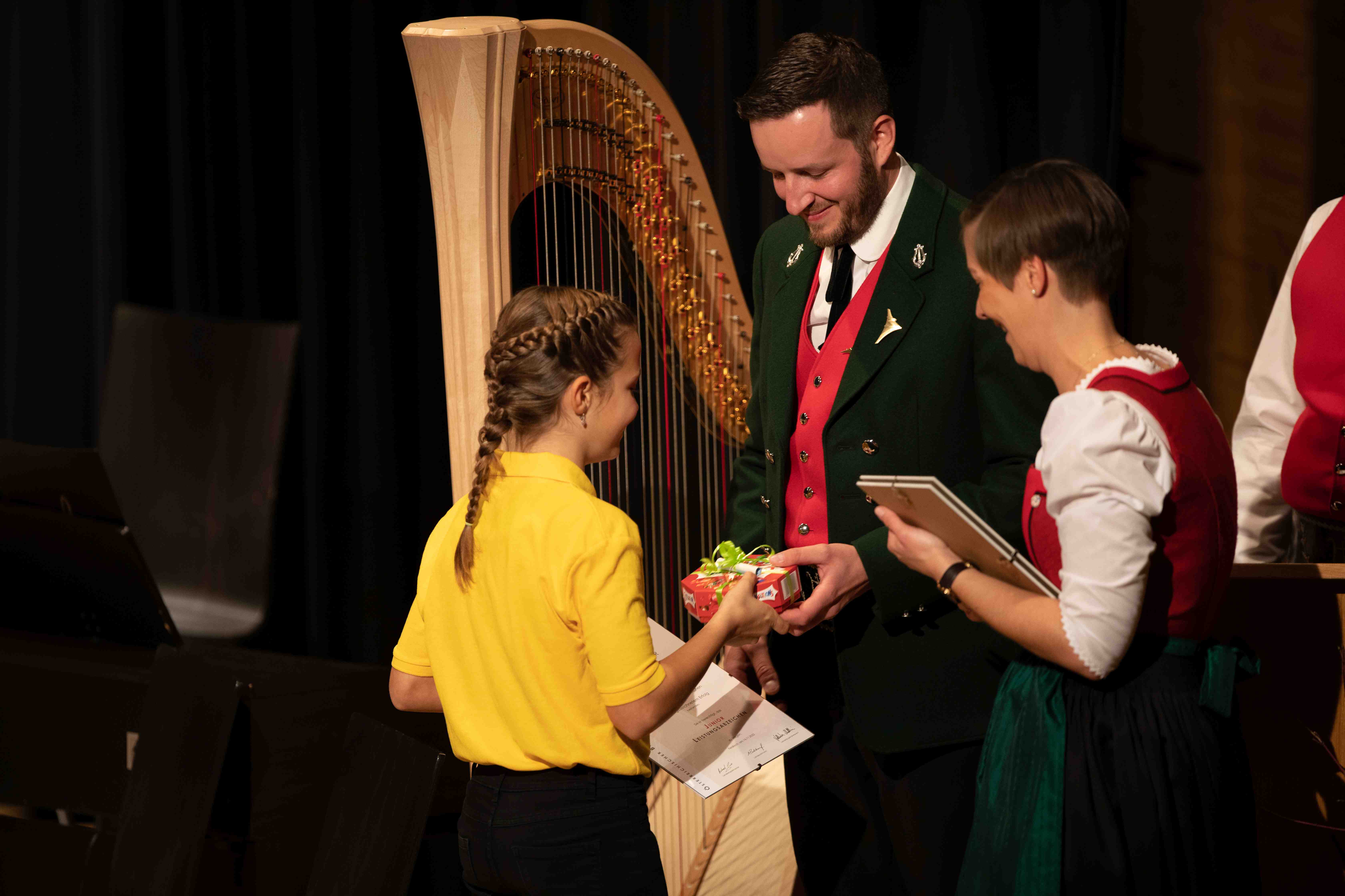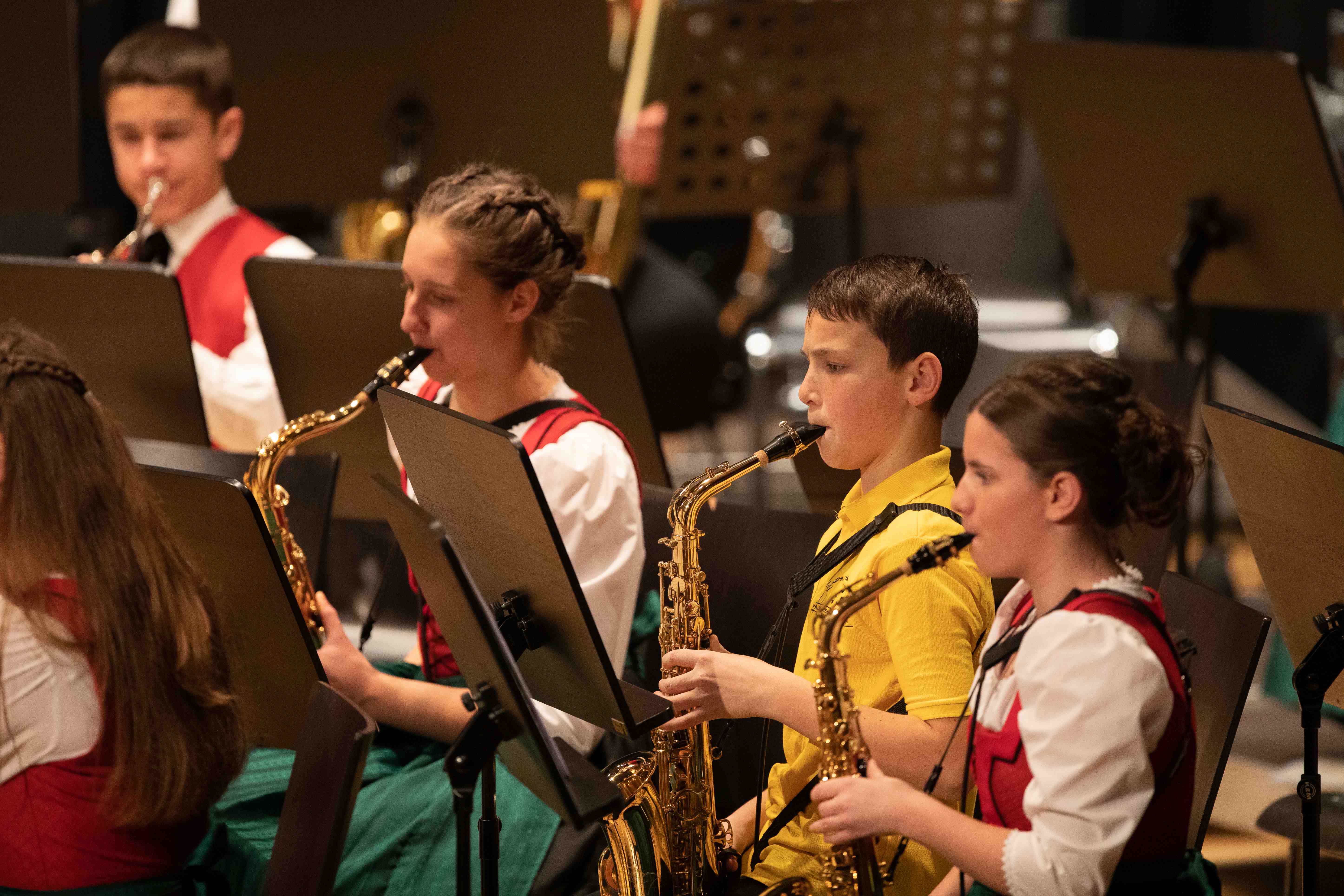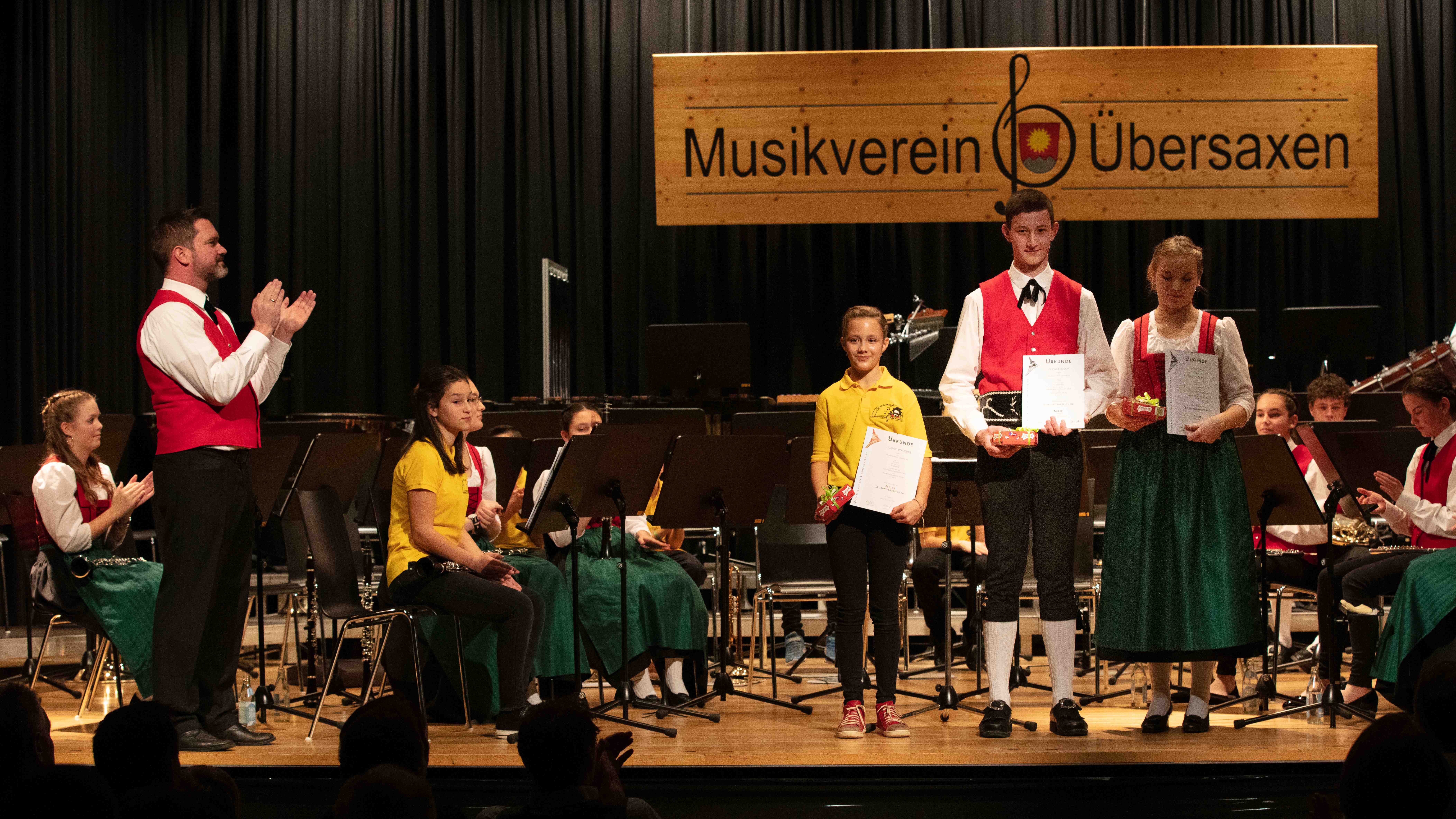 Der Dorfsaal von Übersaxen war am Samstag den 30. November wieder bis auf den letzten Platz gefüllt. Eröffnet wurde der Konzertabend von der musikalischen Jungend, welche sich in diesem Jahr in Form von Ensembles präsentierte. Im Rahmen dieses Abends konnten die Jugendreferentinnen Carina und Julia Lins das Juniorabzeichen an Victoria Nenning, Jana Vith und Maximilian Rinderer und das Leistungsabzeichen in Bronze an Emma Fritsch, Julian Nenning, Hannah Rinderer und Lukas Welte überreichen. Voller Stolz konnten die Jugendreferentinnen an diesem Abend dann sogar noch das Leistungsabzeichen in Gold an Lena Pfitscher und Lorena Lins überreichen.