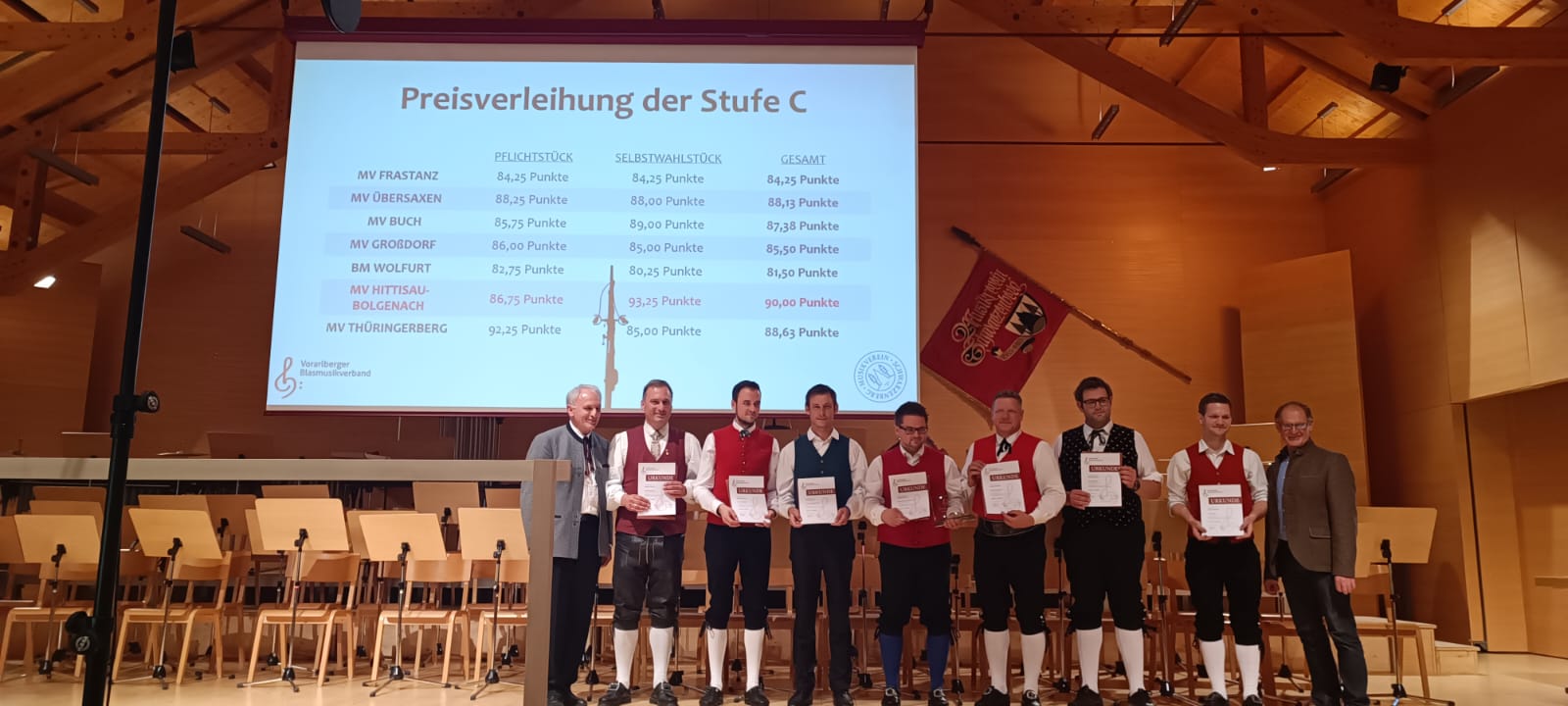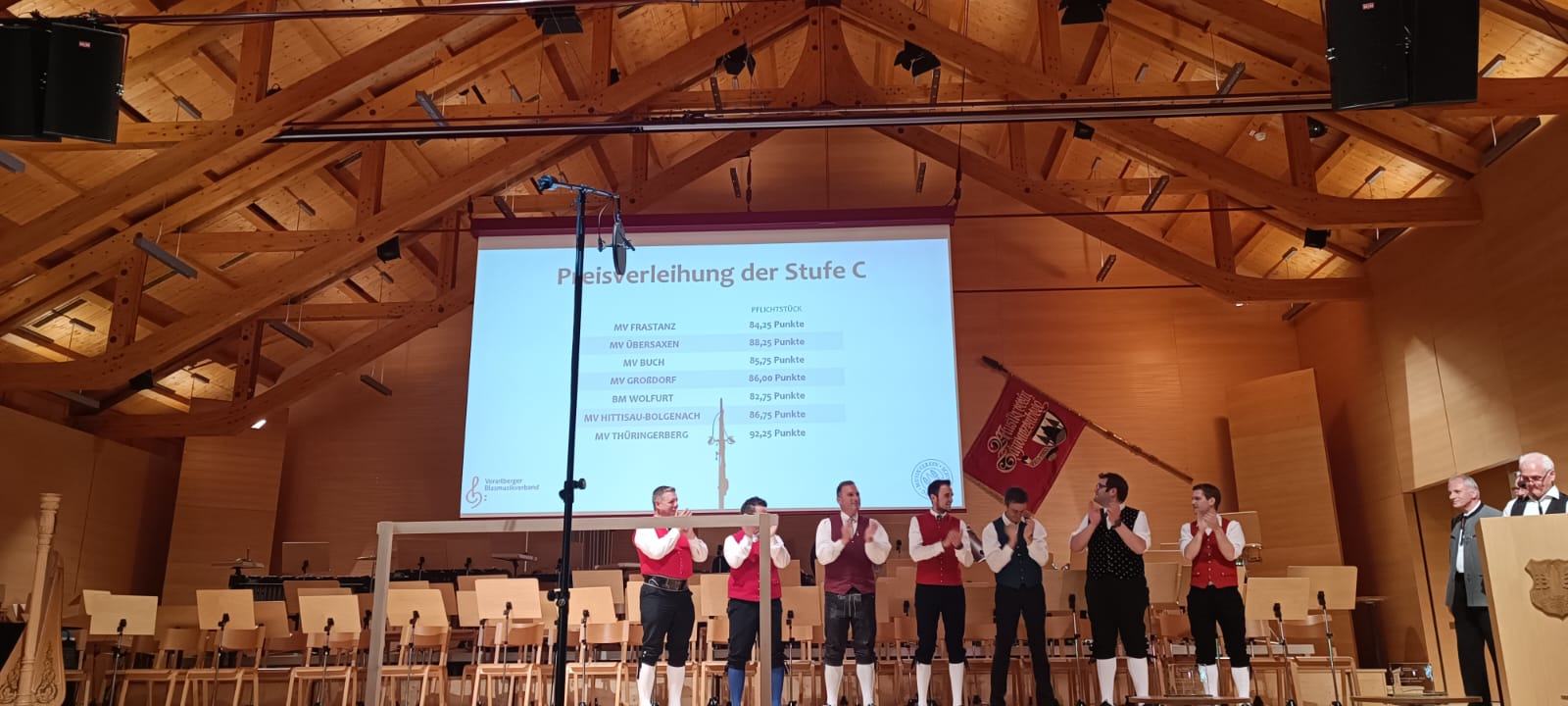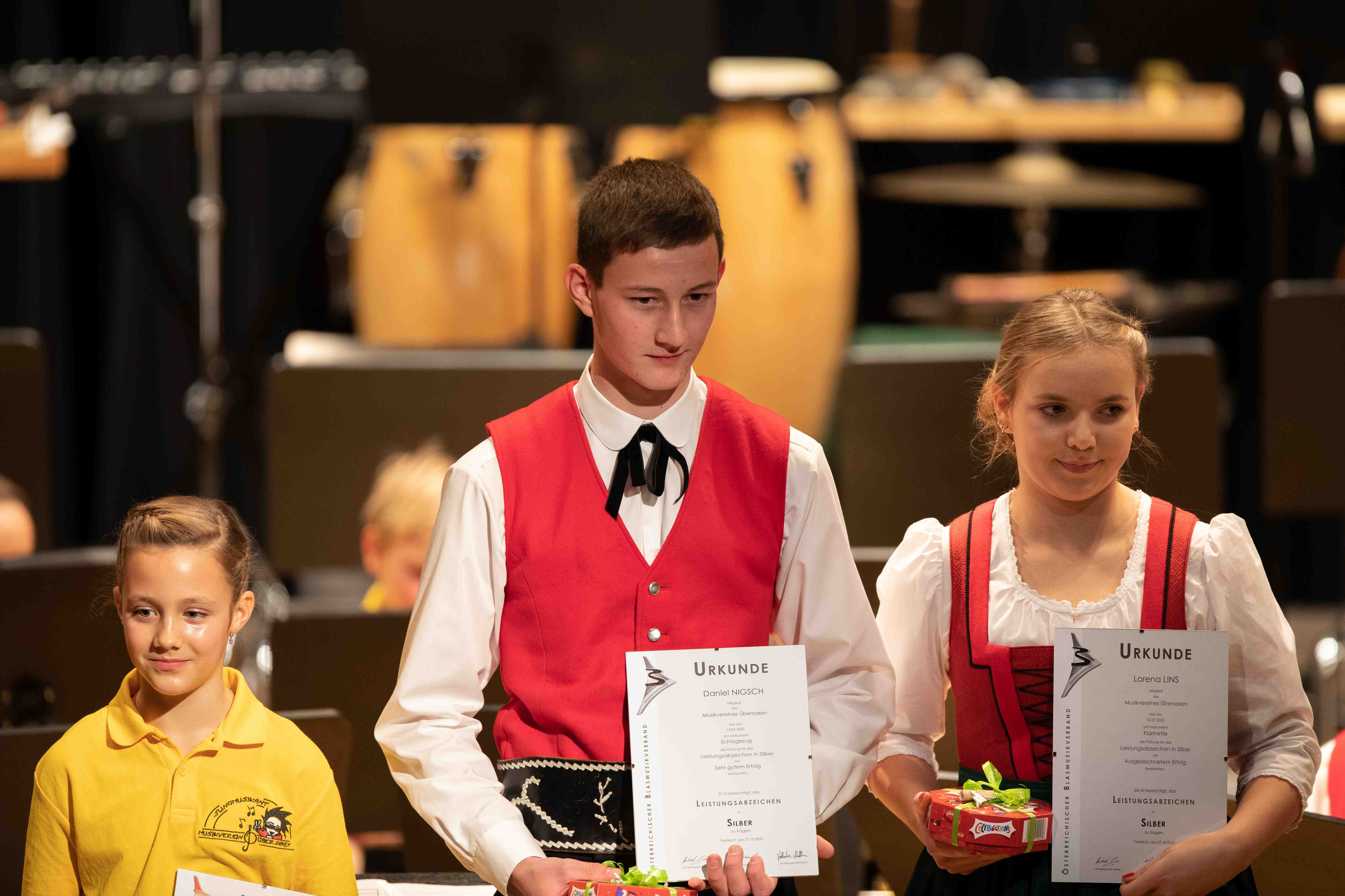 Der Dorfsaal von Übersaxen war am Samstag den 30. November wieder bis auf den letzten Platz gefüllt. Eröffnet wurde der Konzertabend von der musikalischen Jungend, welche sich in diesem Jahr in Form von Ensembles präsentierte. Im Rahmen dieses Abends konnten die Jugendreferentinnen Carina und Julia Lins das Juniorabzeichen an Victoria Nenning, Jana Vith und Maximilian Rinderer und das Leistungsabzeichen in Bronze an Emma Fritsch, Julian Nenning, Hannah Rinderer und Lukas Welte überreichen. Voller Stolz konnten die Jugendreferentinnen an diesem Abend dann sogar noch das Leistungsabzeichen in Gold an Lena Pfitscher und Lorena Lins überreichen.