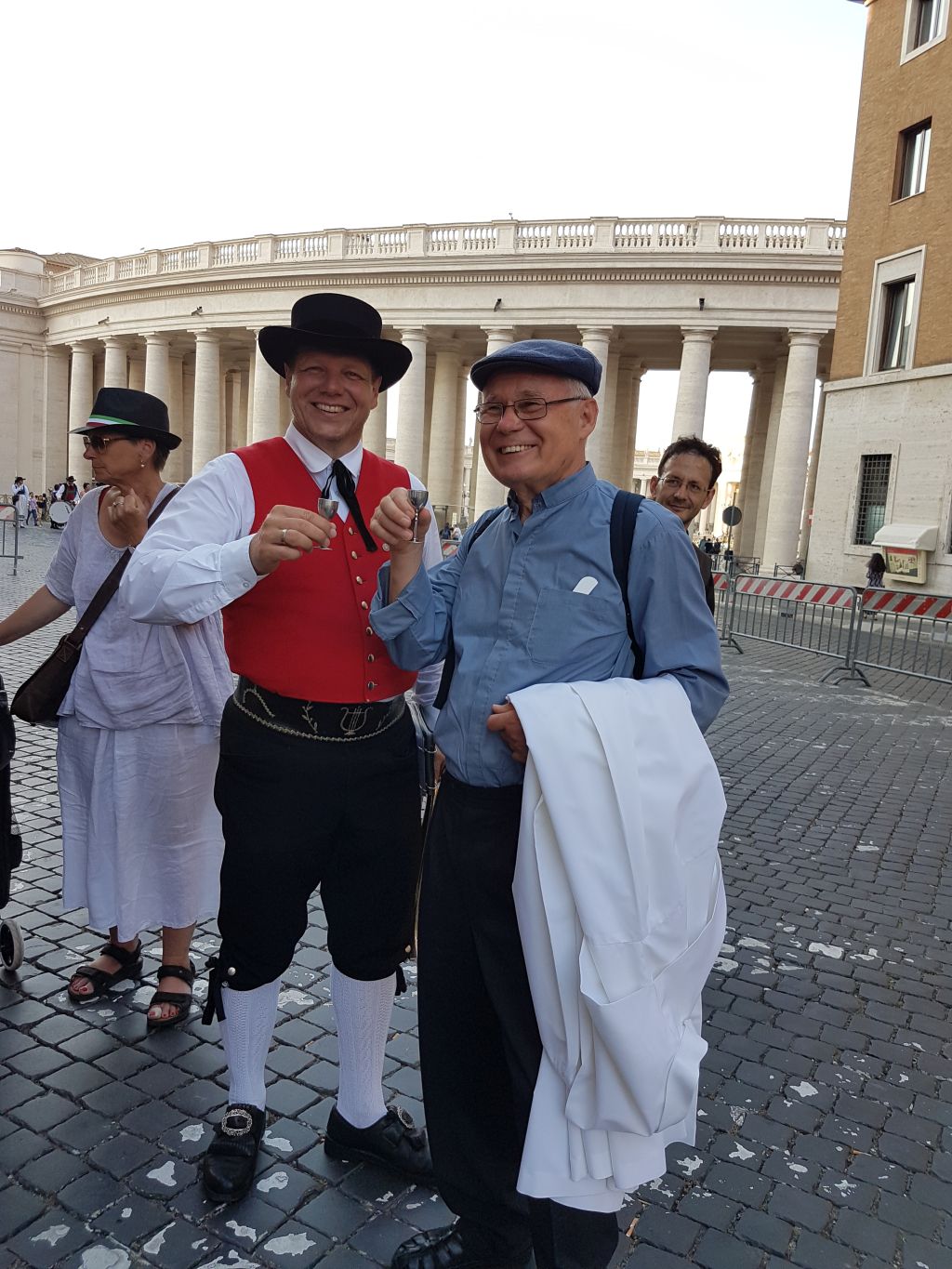 Der Samstagvormittag stand allen zur freien Verfügung für eine Shoppingtour in die Innenstadt oder einen ruhigen Aufenthalt in unserer Unterkunft. Am frühen Nachmittag warfen wir uns wieder in Schale für das Highlight dieses Ausfluges – die Fronleichnamsprozession in den Vatikanischen Gärten – bei glühender Hitze. Wir trafen uns um 15:30 Uhr vor dem Petersdom um die letzten Details noch zu besprechen. Um 16:00 Uhr begann die Prozession zur Lourdes Grotte. Im Anschluss an die Heilige Messe bei der Grotte ging die Prozession wieder durch die Vatikanischen Gärten zurück zum Petersdom. Zum Abschluss der dreistündigen Prozession spielten alle Musikkapellen noch gemeinsam die Deutsche, Schweizer, Italienische und Österreichische Bundeshymne, die Papsthymne sowie die Hymne des Campo Santo. Auch den letzten Abend ließen wir dann bei gemütlichem Beisammensein in unserer Unterkunft ausklingen.