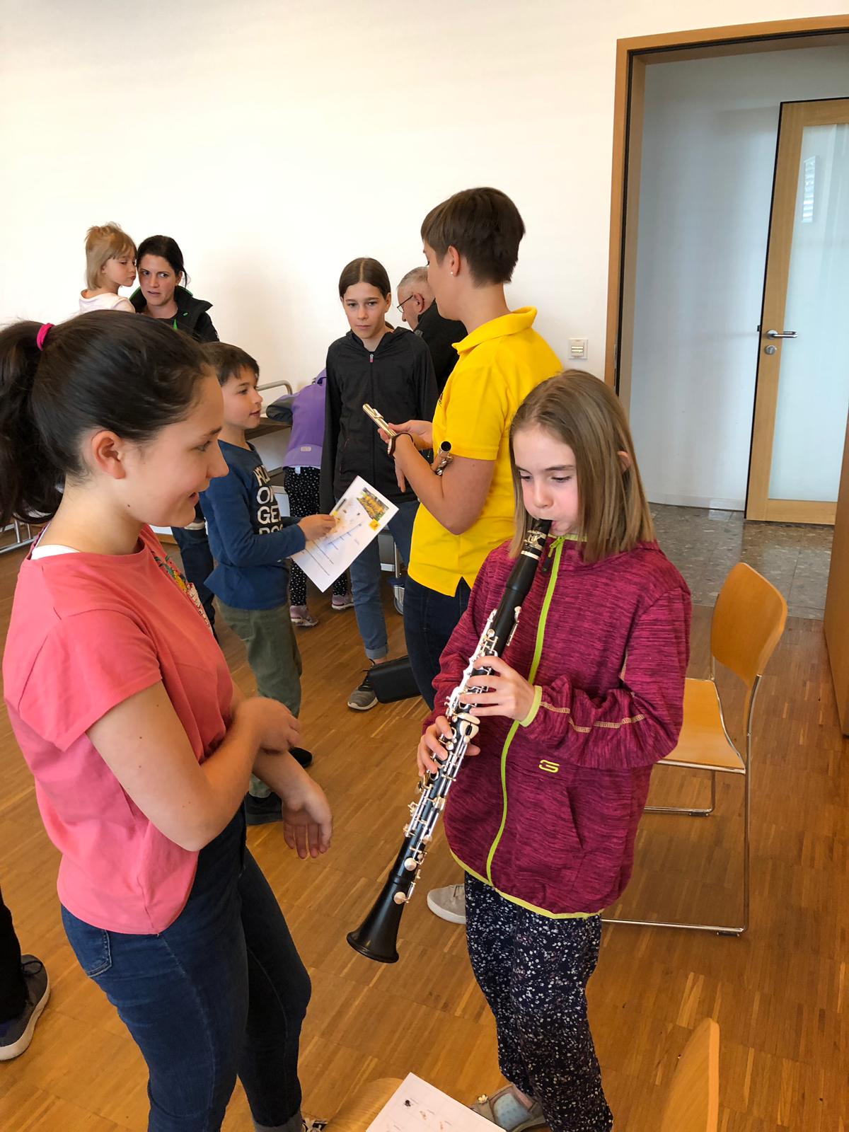 Im Anschluss an die Vorstellungen der Instrumente konnten die Kinder die verschiedenen Instrumente selber ausprobieren und staunen, wie gut es geht, den verschiedenen Instrumenten ein paar Töne zu entlocken.