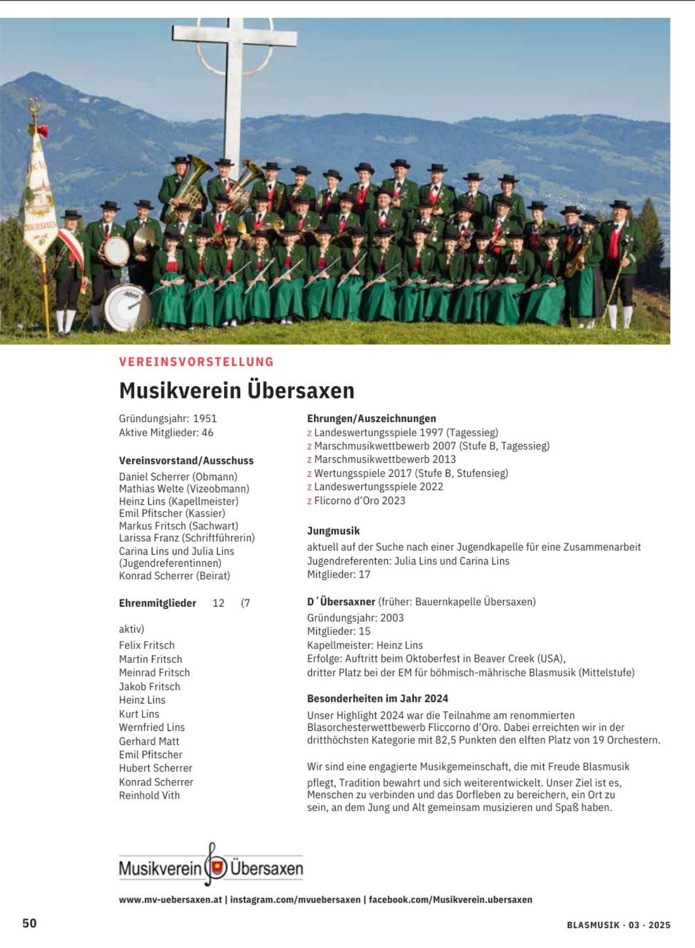 Vereinsvorstellung vom MV-Übersaxen in der aktuellen Ausgabe (03/2025) der ÖBZ (ÖSTERREICHISCHE BLASMUSIKZEITUNG), dem offiziellen Printmedium des Österreichischen Blasmusikverbandes.