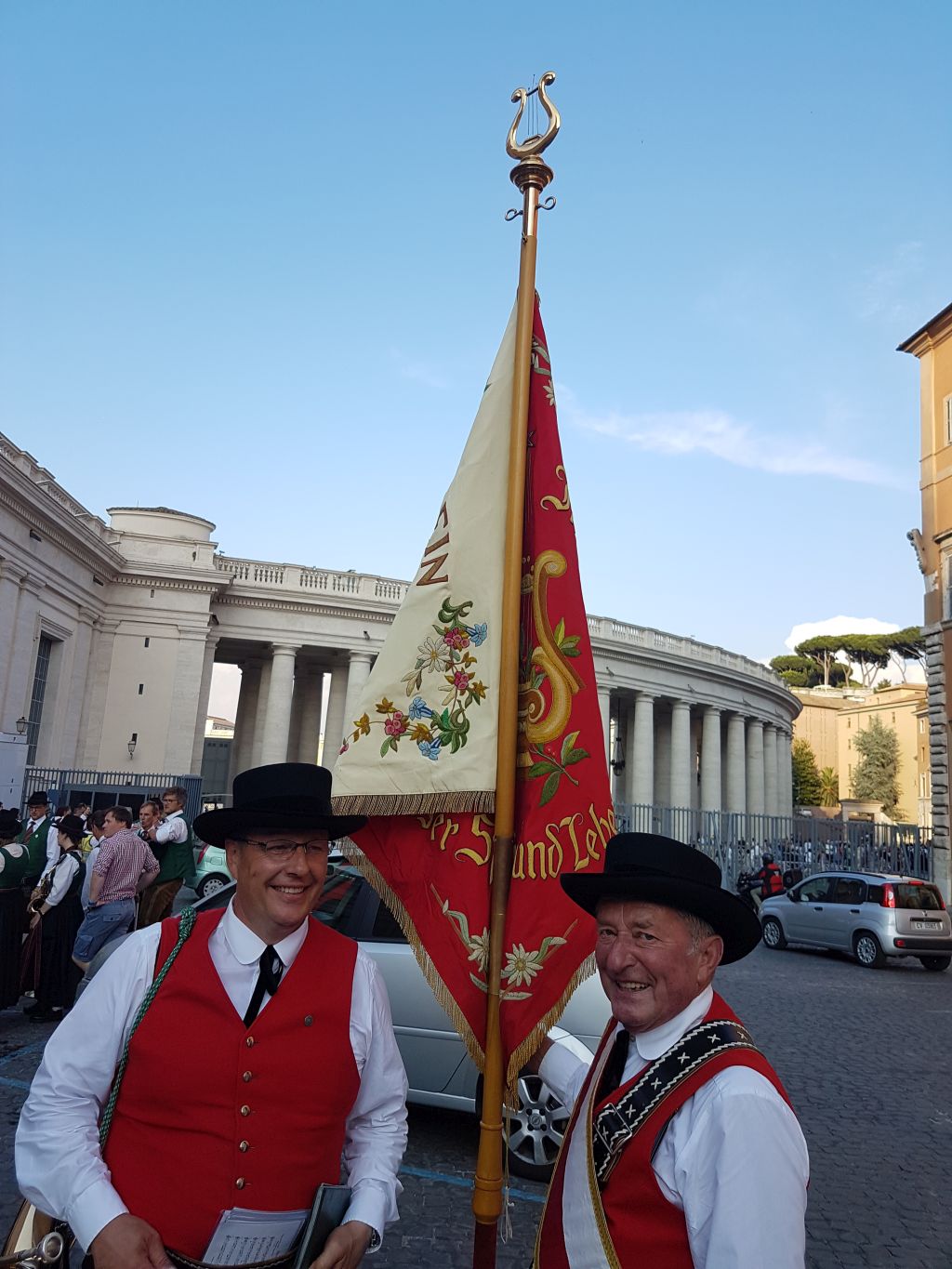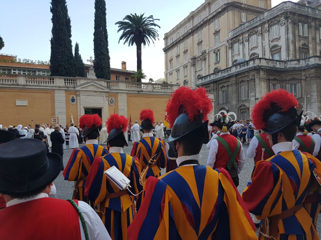 Der Samstagvormittag stand allen zur freien Verfügung für eine Shoppingtour in die Innenstadt oder einen ruhigen Aufenthalt in unserer Unterkunft. Am frühen Nachmittag warfen wir uns wieder in Schale für das Highlight dieses Ausfluges – die Fronleichnamsprozession in den Vatikanischen Gärten – bei glühender Hitze. Wir trafen uns um 15:30 Uhr vor dem Petersdom um die letzten Details noch zu besprechen. Um 16:00 Uhr begann die Prozession zur Lourdes Grotte. Im Anschluss an die Heilige Messe bei der Grotte ging die Prozession wieder durch die Vatikanischen Gärten zurück zum Petersdom. Zum Abschluss der dreistündigen Prozession spielten alle Musikkapellen noch gemeinsam die Deutsche, Schweizer, Italienische und Österreichische Bundeshymne, die Papsthymne sowie die Hymne des Campo Santo. Auch den letzten Abend ließen wir dann bei gemütlichem Beisammensein in unserer Unterkunft ausklingen.